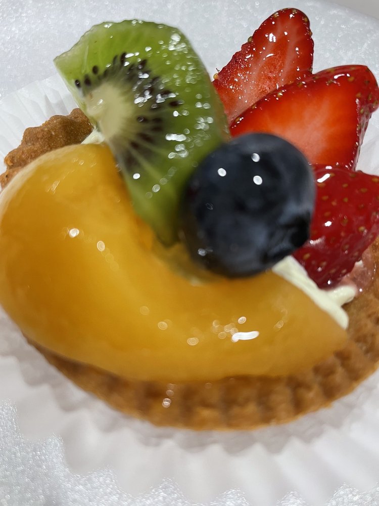 This classic fruit tart has a pastry crust filled with vanilla pastry cream. It's topped with assorted fresh fruit, often arranged in a decorative pattern, and finished with a apricot glaze.